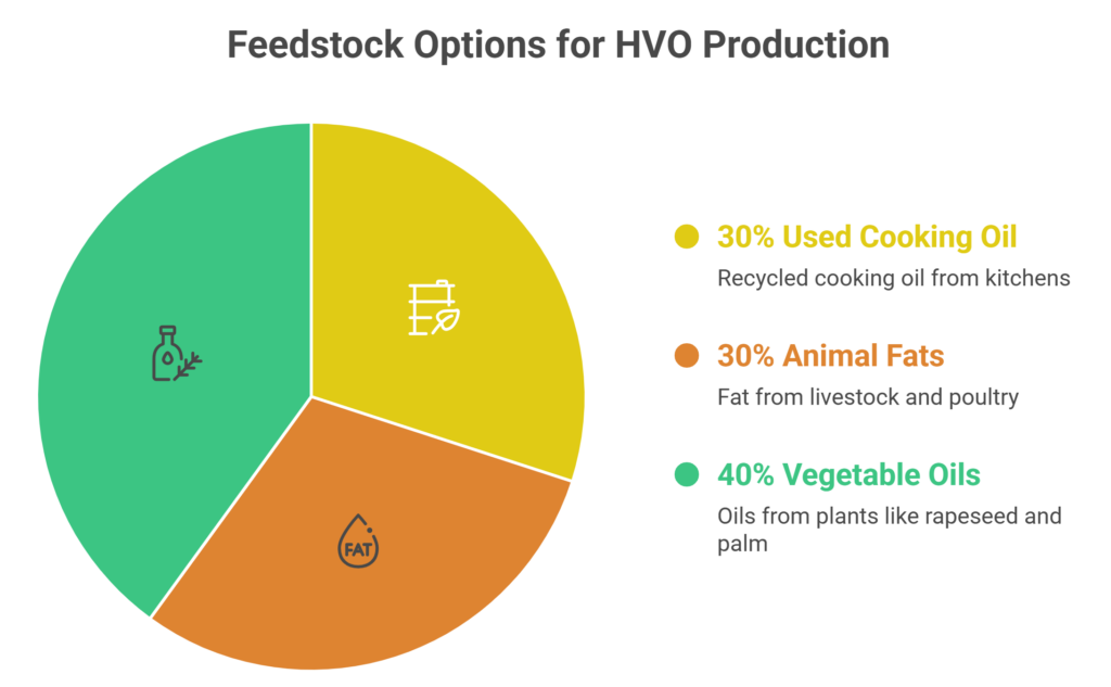 Unlike traditional biodiesel (Fatty Acid Methyl Ester – FAME), HVO fuel is created through a hydrogen-based refining process, where oxygen is removed from the feedstock using catalytic reactions. This process transforms the raw materials into pure hydrocarbons.