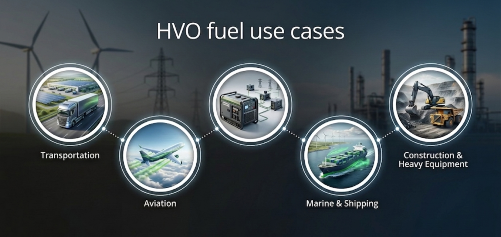 Exploring key HVO fuel uses and renewable diesel applications across transportation, aviation, and power sectors globally.